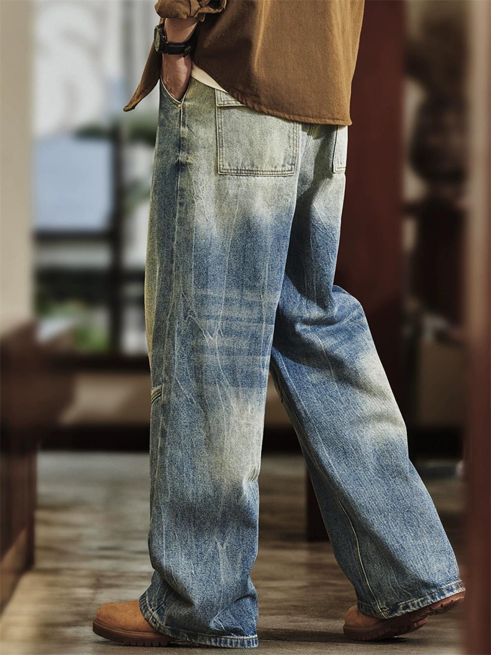 高端做旧重工水洗牛仔裤男秋冬潮牌宽松直筒阔腿工装长裤子