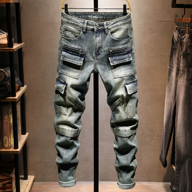 高端复古牛仔裤男春秋季潮牌痞帅美式工装修身小脚裤子男2024新款