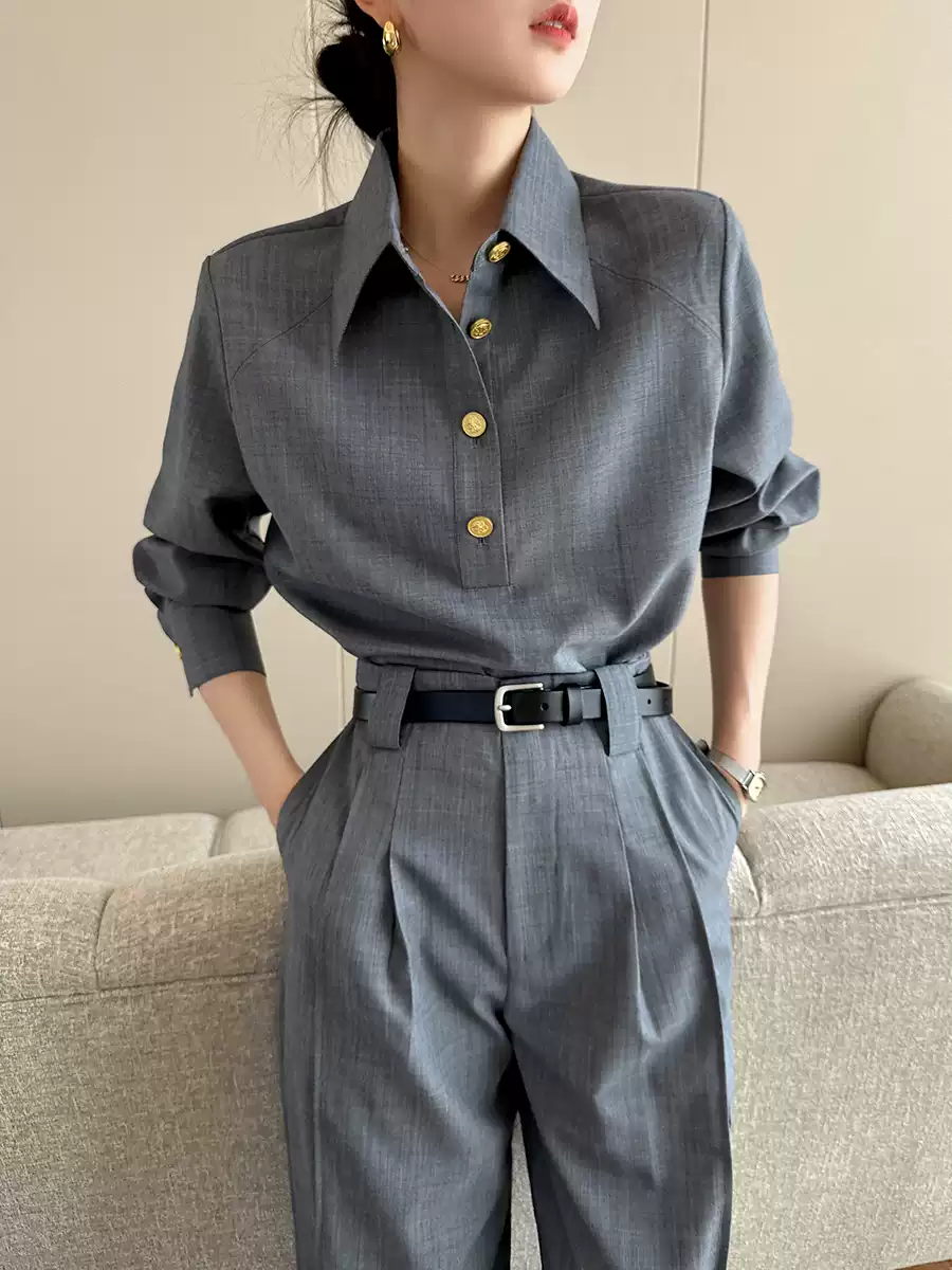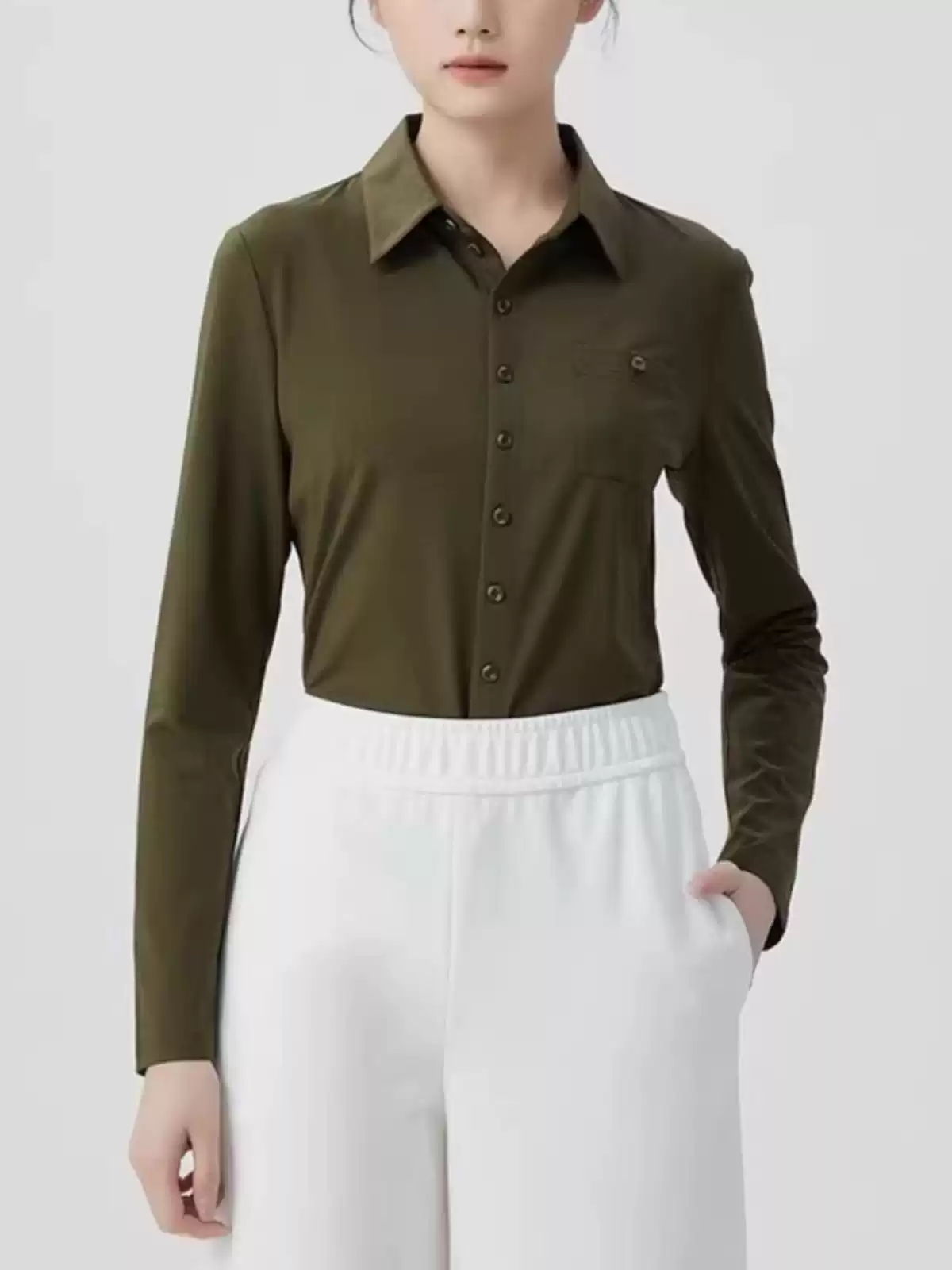 2024秋冬新款POLO领纯色长袖衬衫女上衣通勤简约修身衬衣