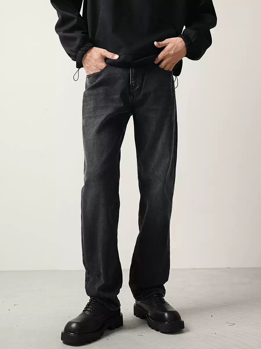 高端复古宽松牛仔裤男秋冬新款加绒黑色水洗直筒休闲长裤子